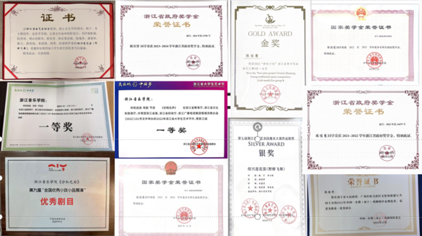 荣获中国-东盟戏剧周“朱槿花·优秀演员”,第七届浙江省曲艺杂技魔术大赛银奖,并多次省政府奖学金、优秀学生奖学金及专业优秀奖学金等各项荣誉。