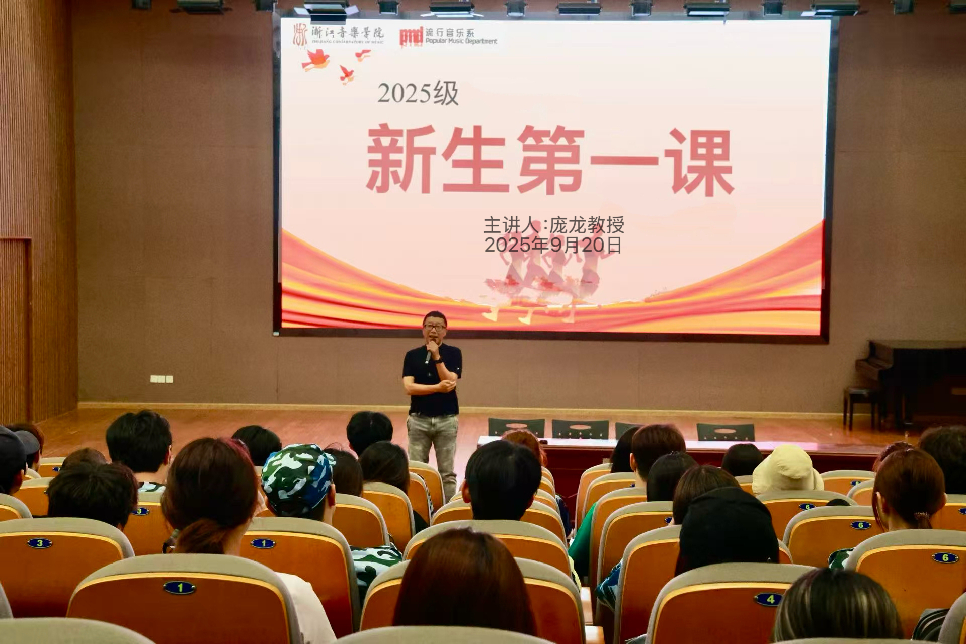 9月20日晚,流行音乐系“开学第一课”系列教育活动在音教小剧场拉开帷幕。流行音乐系教授、著名音乐人庞龙担任主讲,流行音乐系全体2025级新生参加。