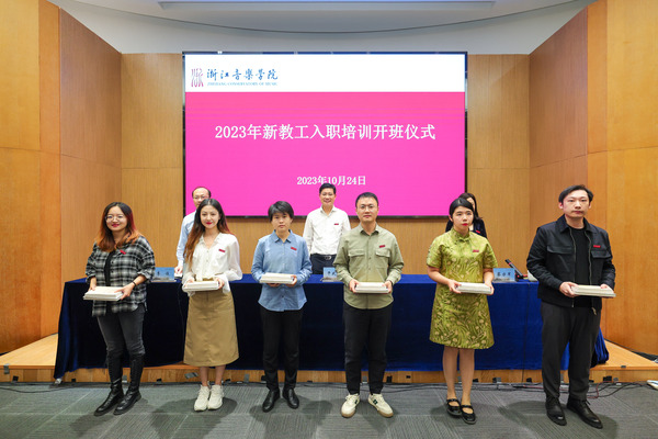 仪式上,干武东代表学院对新入职教职工表示欢迎。他介绍了学院的总体情况及近年取得的发展成绩,与全体新教职工一起重温了习近平总书记9月9日给全国优秀教师代表致信中的殷切嘱托,并对新进教职工提出了希望和要求:一要坚守为党育人初心,牢记立德树人使命。浙音教师既是教育工作者,又是文艺工作者,更要知晓肩上的重任,追求德艺双馨,争做“四有”好老师,把正确的道德观传递给学生,努力为学生打牢人生之基、发展之基,系好“人生第一粒扣子”。二要回应时代课题,践行“强国有我”。作为浙音的新生力量,要深入贯彻落实习近平总书记考察浙江重要讲话精神,充分发挥自身的专业优势和过硬的专业本领,坚持以人民为中心的创作导向,坚持守正创新,努力创作更多优秀的精品力作,在文化强省建设中担大任、挑大梁、立新功。三要坚持爱校荣校,做浙音发展的主人翁。作为浙音大家庭的一份子,要牢固树立主人翁意识,主动将人生规划、奋斗目标、工作重心与学院发展大局、改革大局紧密结合,立足本职,团结协作,汇聚起推动学院高质量发展的强大合力,坚定不移为学院“高水平一流”建设以及各项事业高质量发展做出贡献。